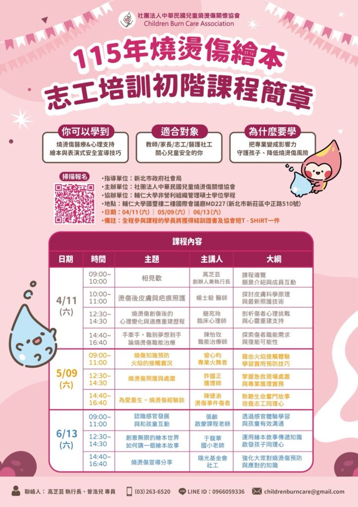 歡迎參與我們的燒燙傷繪本志工培訓課程!這個獨特的培訓將集結整形外科醫師、專科護理師、臨床心理師、職能治療師、專業火舞表演者、國小老師、幼兒啟蒙課程老師,以及燙傷事件的倖存者,為您提供全方位的知識與技能,使您成為一位充滿愛心、了解如何宣導燒燙傷知識的志工。