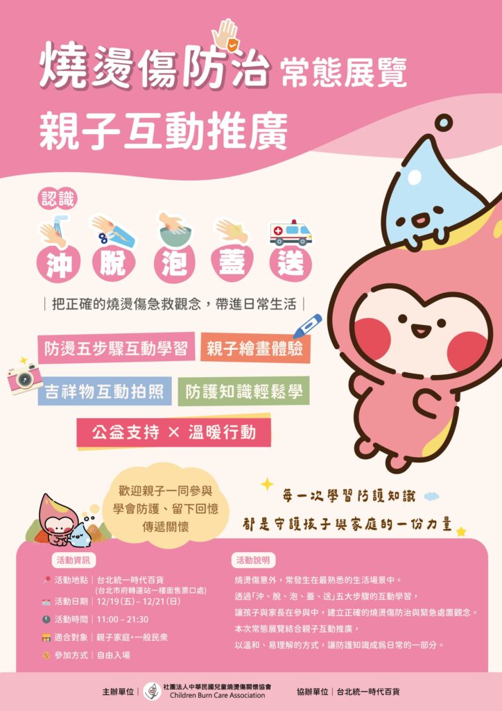 燒燙傷意外多發生於日常生活中,為提升民眾對燒燙傷防護與緊急處置的正確認知,社團法人中華民國兒童燒燙傷關懷協會辦理「燒燙傷防治常態展覽 × 親子互動推廣」活動,透過親子互動體驗,將防護知識融入生活學習。